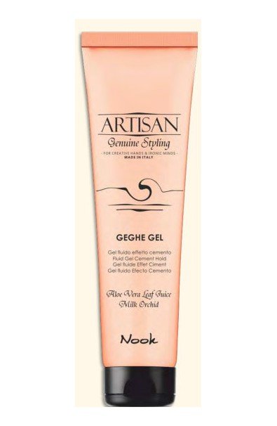 GEGHE GEL Artisan Nook, Gel Fluido Effetto cemento. Definisce e scolpisce creando un brillante effetto bagnato a tutti i tipi di styling. Garantisce un controllo estremo ai capelli ribelli e difficili, rispettandone la struttura e proteggendoli dall’umidità e dal calore. Tenuta forte.