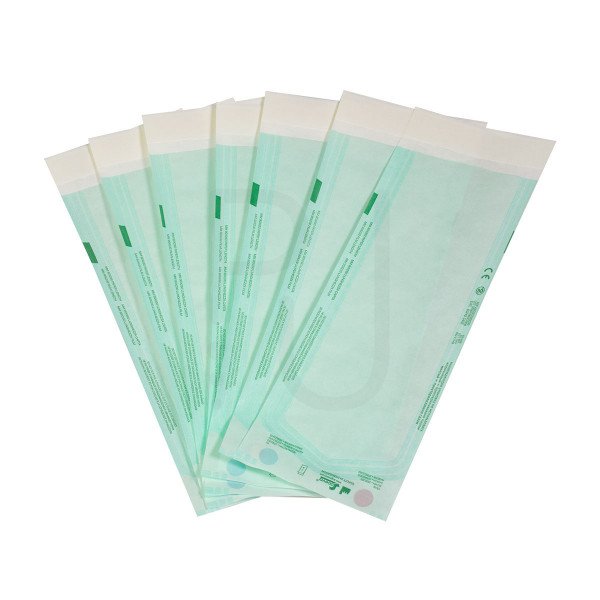 Buste auto sigillanti per sterilizzare in autoclave o conservare strumenti già sterilizzati, con incluso l’indicatore di avvenuta sterilizzazione. Dimensioni: 9 cm x 23cm in confezione da 200 pezzi.